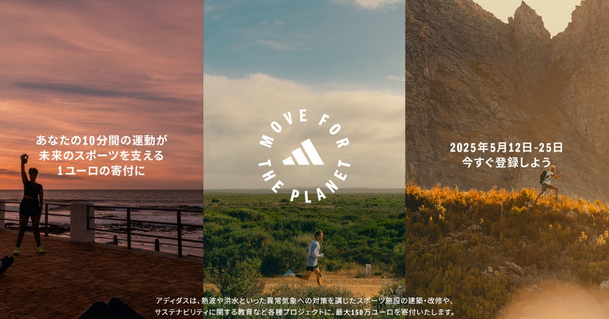 未来のスポーツ環境を支えるためのグローバルムーブメント「MOVE FOR THE PLANET」を、アディダスが2025年5月12日(月)~25日(日)まで開催します。10分間の運動を行うたびに、アディダスがスポーツ環境に関する様々なプロジェクトに1ユーロを寄付してくれます。