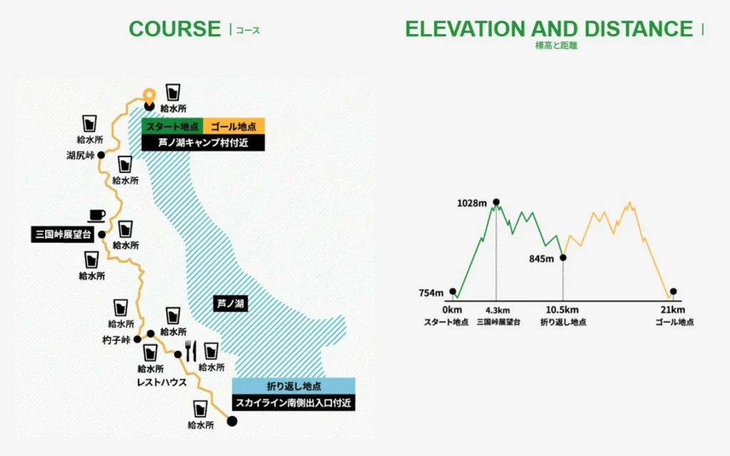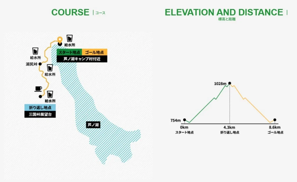 芦ノ湖キャンプ村付近をスタートした後、芦ノ湖スカイラインを一気に300mの標高を駆け上がり富士山の絶景が望める三国峠で折り返す、景色を楽しみながらのランニングにぴったりの全長約9kmのコース。制限時間も約5時間と余裕もあることから、休憩をしながらの軽いジョギングでも完走可能です。