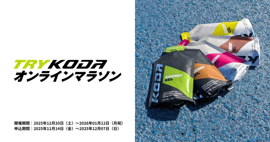 そんな「KODAエネルギージェル」が参加者全員にプレゼントされるオンラインマラソン「TRY KODA オンラインマラソン」が参加者を募集しています。タイムではなく大会期間中の累計走行距離を競うスタイルなので、誰にでも入賞するチャンスがあります。「KODAエネルギージェル」を試してみたいという方は、オンラインマラソンにご参加ください。