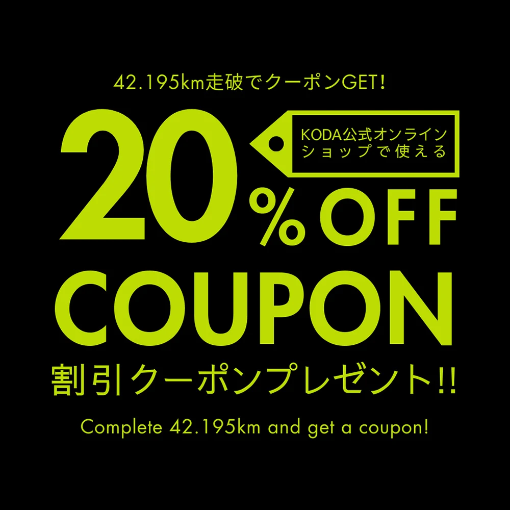 | 参加特典 | ◆ 参加者全員プレゼント KODAエネルギージェル5個セット ◆ 上位賞 累計走行距離の男女別上位1~3位(計6名)に賞品を贈呈 ◆ 完走賞 大会期間内で42.195km以上を走破した方全員に、KODA公式オンラインショップで使用できる20%OFFクーポンがプレゼント。 ※クーポンは大会終了後に紙媒体でご利用ください。 ◆ TRYKODA賞 100km以上走った人の中から抽選で5名の方にジェル7個 (全フレーバー1個ずつ)をプレゼント |