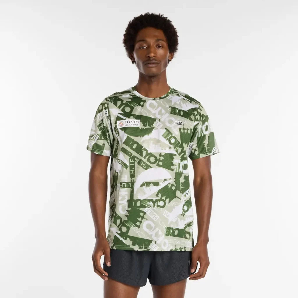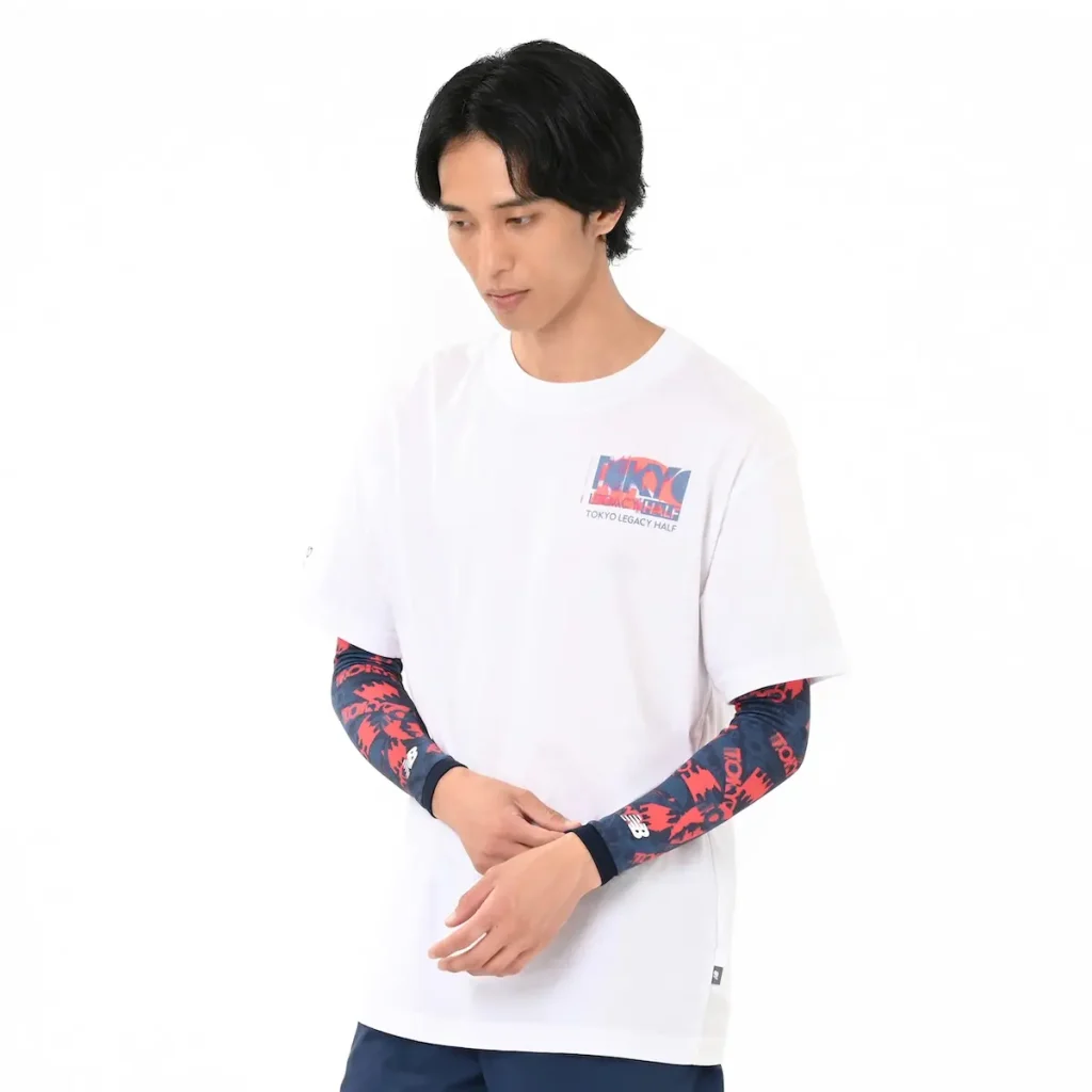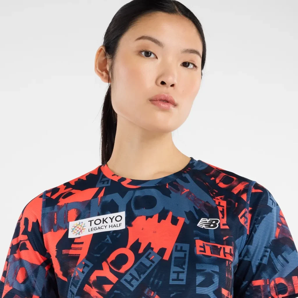 東京の街をモチーフにしたオールオーバーグラフィックプリントと、右胸の東京レガシーハーフの大会ロゴがアクセント。左胸のNBフライングロゴは柄の中でも視認できるマットプリントで演出しています。