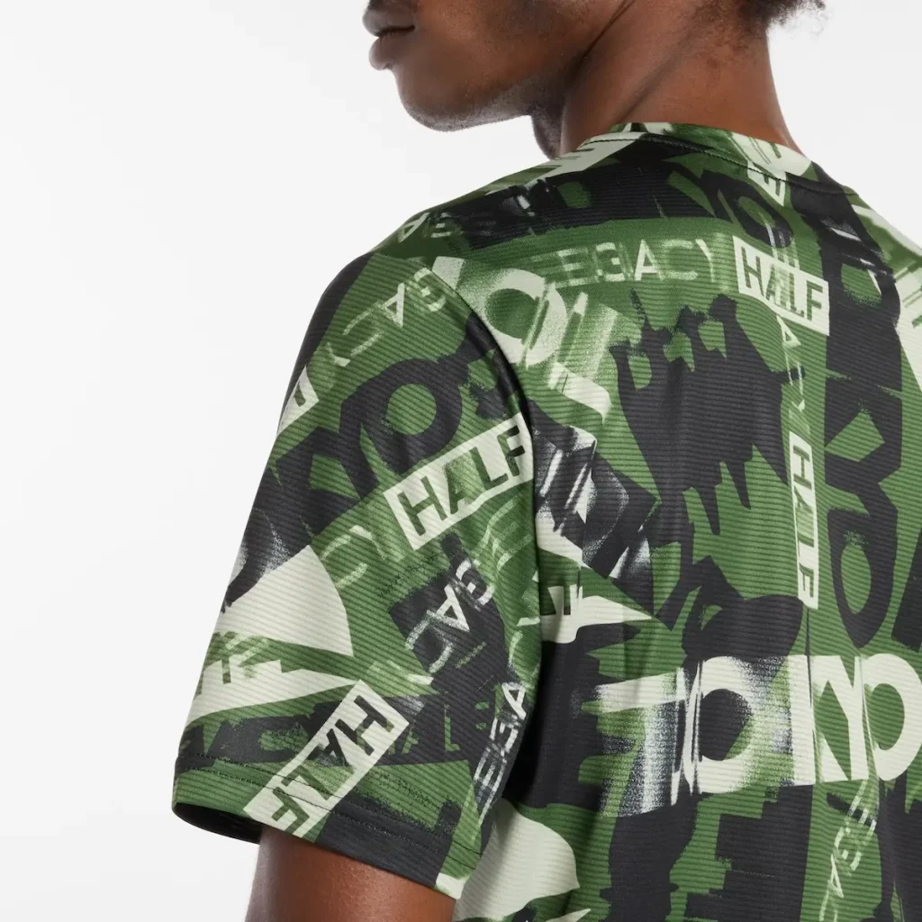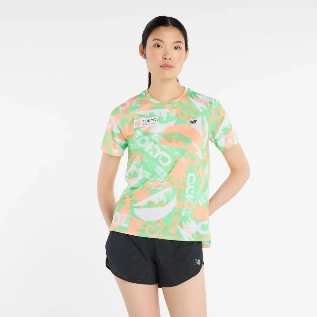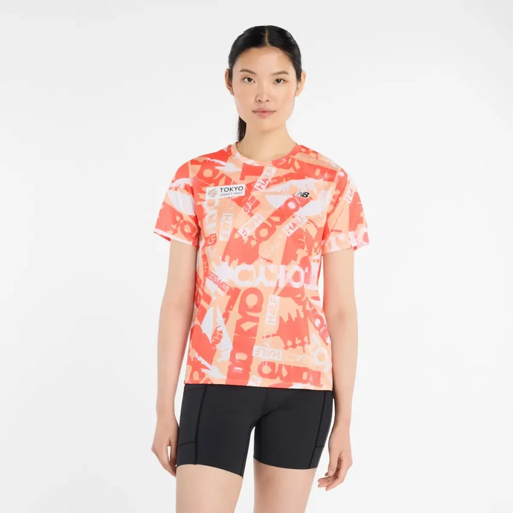 東京の街をモチーフにしたオールオーバーグラフィックプリントと、右胸の東京レガシーハーフの大会ロゴがアクセント。左胸のNBフライングロゴは柄の中でも視認できるマットプリントで演出しています。