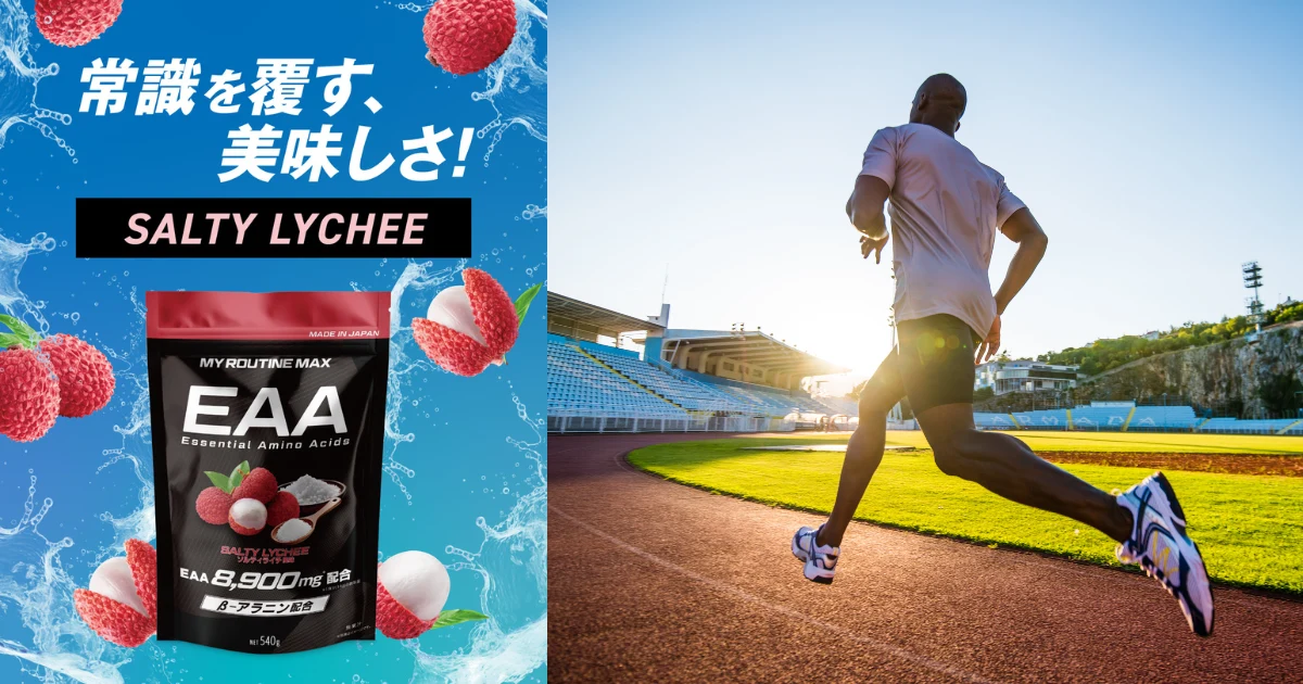 マイルーティーンMAX EAAシリーズはまさに、その「美味しさ」にこだわったEAAサプリメントで、これまで発売されていたマンゴー風味とパイナップル風味に合わせて、塩味と甘さのバランスに優れ、水分補給感覚でごくごく飲めるソルティライチ風味が登場しました。