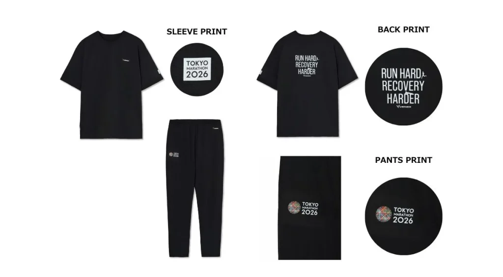 デザインは、「東京マラソン2026」のロゴデザインと、VENEXが掲げる応援メッセージ「RUN HARD, RECOVERY HARDER」のデザインの2種類。それぞれ、ショートスリーブロングパンツの上下セットと、ロングスリーブロングパンツの上下セットをが用意されています。