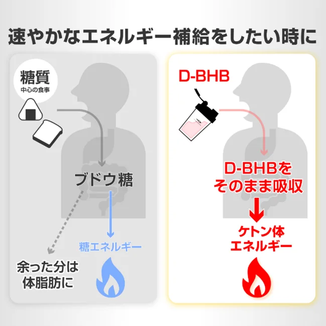 ケトン体(D-BHB)は通常、糖質制限や絶食などで糖エネルギーが枯渇した際に、糖に代わるエネルギー源として働く成分です。ケトン体を糖エネルギーが枯渇していない状況で摂取し、運動などを行うと、糖エネルギーよりも優先してケトン体エネルギーを消費するため、糖エネルギーを体内にとどめておくことができます。
