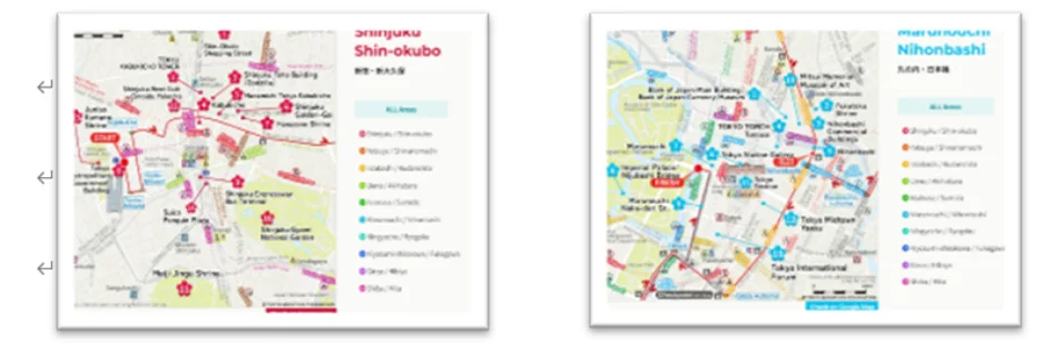 新宿・新大久保、浅草・墨田、丸の内・日本橋など、マラソンコースに沿ったエリアごとに観光スポットを掲載。応援ポイントのそばで立ち寄れる名所や散策スポットが分かるため、「応援の合間、どこに行こう?」という悩みを解消できます。