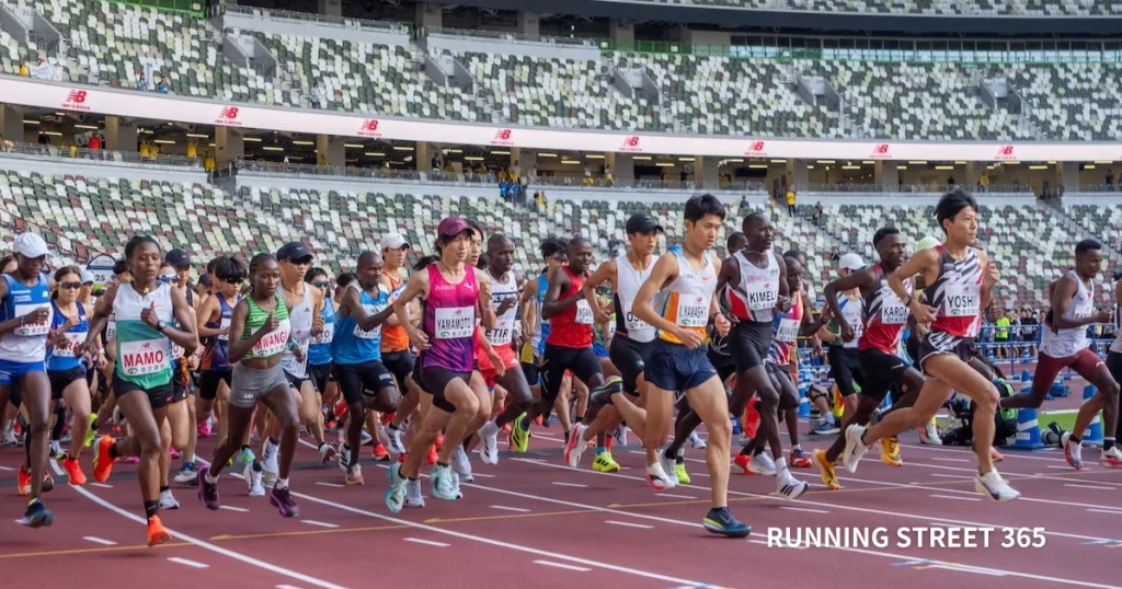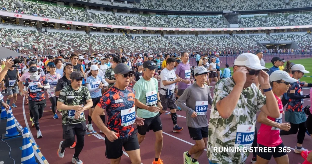 不思議なもので、このような緊張感はどんどん伝染していくようで、競技場内で待機しているランナーがどことなく神妙な面持ちで、号砲を待っているように感じました。ただし、スタートすればそこからはもう走り出すしかないわけで、持ちタイムが早い前方のランナーはあっという間に競技場を飛び出していきます。