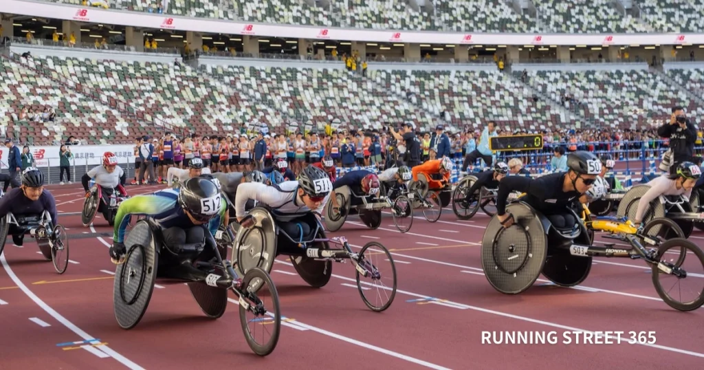 大会はチアの応援からスタートし、会場が温まったところで車いすの部がスタート。正式名称は「障がい者(車いす)の部」で、さすがに車いすと一般のランナーが一緒に走り出すのは危険ですので、東京マラソンと同様に車いすランナーが先行してスタートしています。