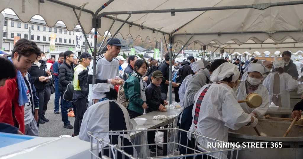 そしてなんとかフィニッシュしたわけですが、いつもならそこからすぐに後方のランナーの撮影に向かうのですが、宮古サーモン・ハーフマラソンはそういうわけにはいきません。この大会は完走後にメインイベント「サンマの塩焼き・鮭汁・鮭ご飯」が待っています。
