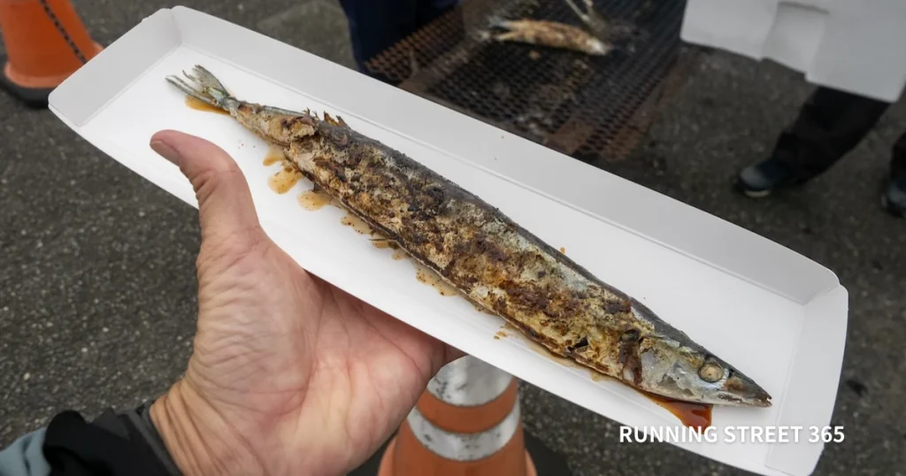 私がゴールした時点で、鮭汁と鮭ご飯には大行列。だからまずはサンマの塩焼きから。贅沢にもサンマの塩焼きを1人1本丸ごと。しかもその場で炭火焼きしてくれます。ハーフマラソンを走った上にお昼時なので、あっという間に平らげてしまいました。