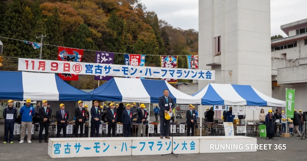 宮古駅でバスを降りたら、とにかく寒い。さすがに東北の11月。地元の人たちはダウンコートを着ていたので5℃くらいだったのかもしれません。そして曇り空ということもあって、ハーフマラソンのスタート会場に移動する時間になっても肌寒さを感じます。