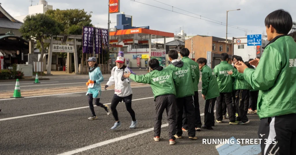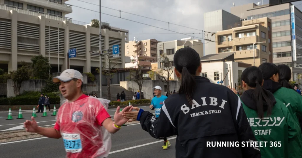 そして愛媛マラソンといえば、沿道の声援が素晴らしいことで有名ですが、今年は学生ボランティアの配置が例年よりも細かく分かれていたのか、どこを走っていても若さあふれる声援でランナーを鼓舞してくれました。