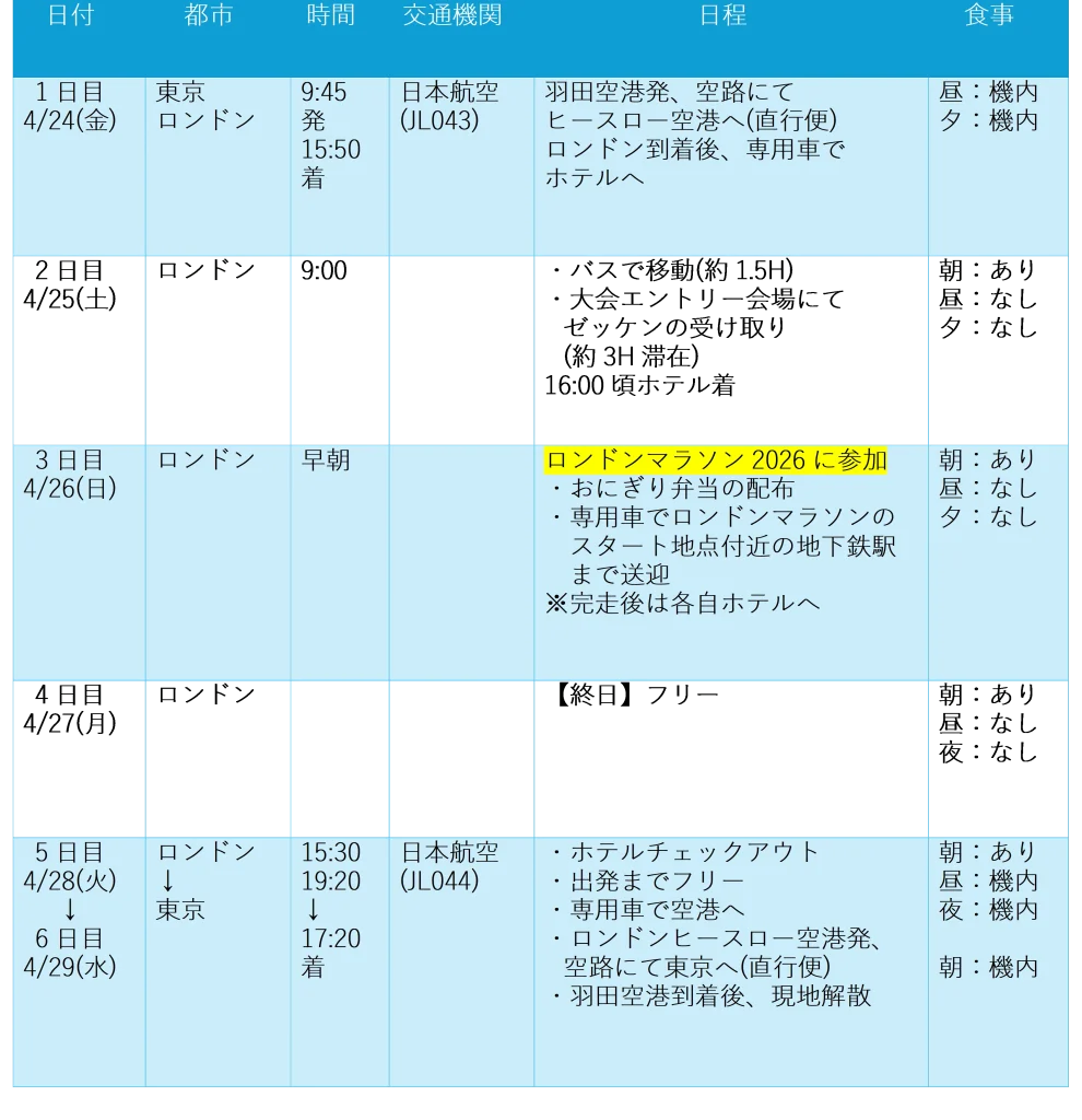 2026年4月26日(日)に開催が予定されている「ロンドンマラソン2026」も、国際興業が出走権が付いたツアーを企画し、11月7日(金)より販売を開始します。ロンドンマラソンも人気が高く、なかなか出走できない大会ですので、絶対に走りたいという方は利用を検討してみてはいかがでしょう。