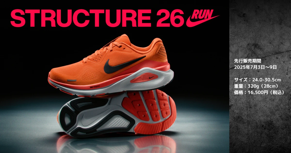 そんな「ナイキ ストラクチャー 26」が、一般販売に先駆けて、全国のスポーツデポやアルペンの店舗にて先行発売中です。周りのランナーよりも早く入手したいという方は、ぜひ店舗にて「ナイキ ストラクチャー 26」をお求めください。
