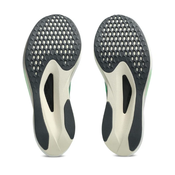 ミッドソールは、アシックスのクッションフォーム材の中で最も軽く優れた反発性を発揮する「FF LEAP(エフエフリープ)」と「FF BLAST PLUS(エフエフブラストプラス)」を組み合わせて使用しており、上層部に「FF LEAP」を採用しています。着地と同時に変形、圧縮し、素早く元の形状に戻ることで、跳ね返るような感覚が得られ、ストライドを伸ばすことが可能になります。