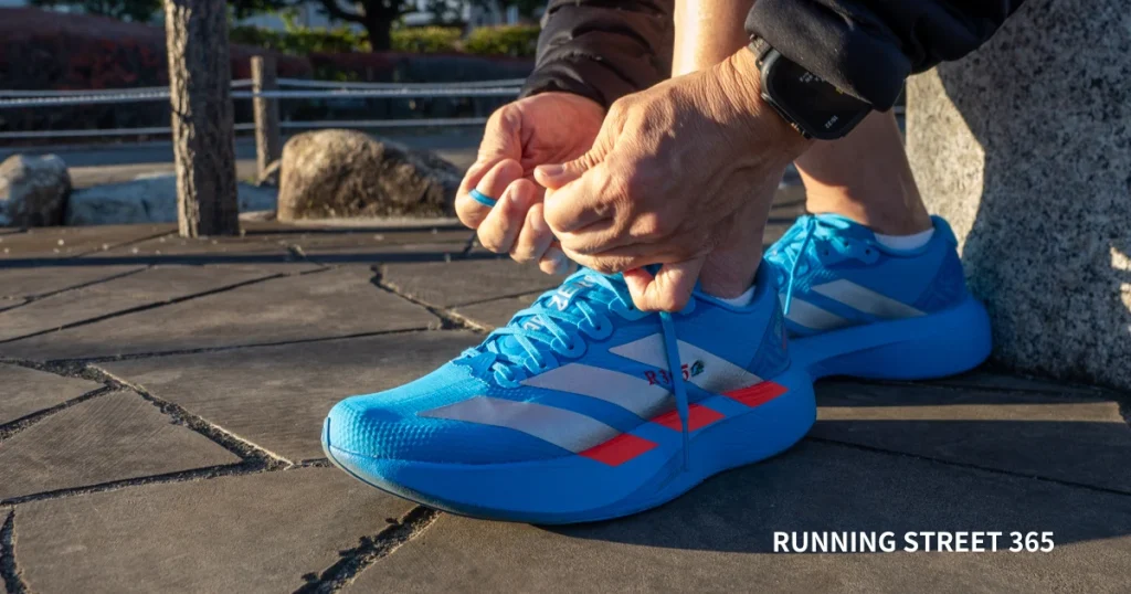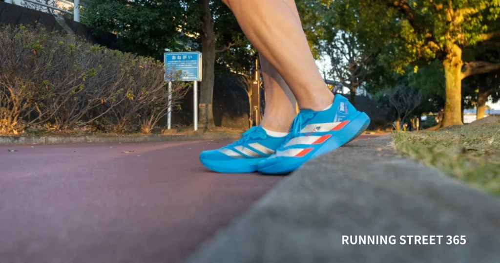 渡しの場合は、ADIZERO EVO SLのほうが肌にフィットする感じがあり、走りに集中できました。このあたりはかなり個人差があると考えられます。