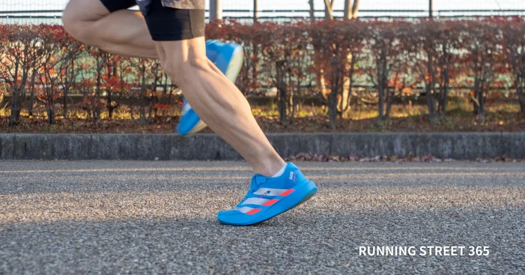 一方のADIZERO EVO SLは、きちんと脚に体重を載せれており、さらに前足部で地面を押すときにロスがなく、ややオーバーペースになってしまいました。