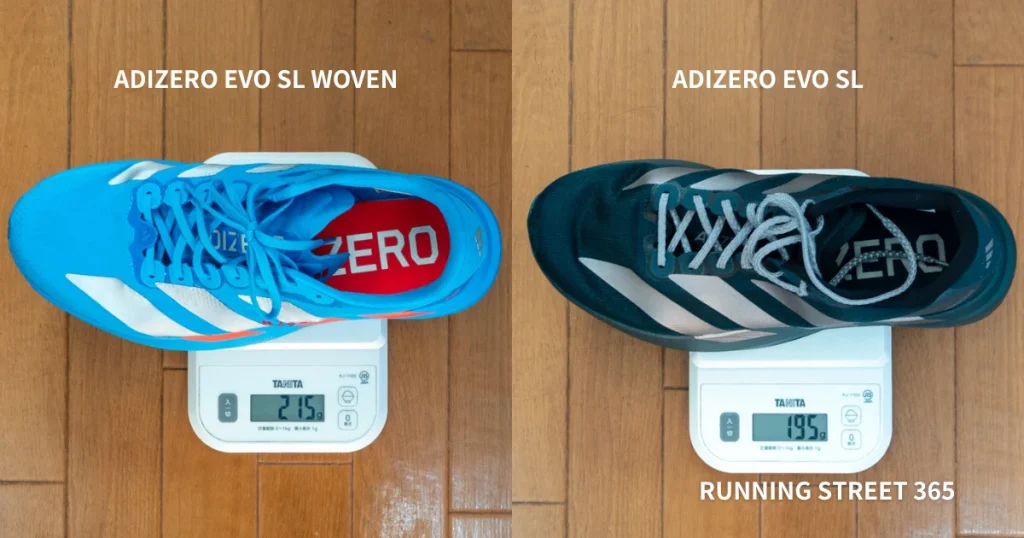 ADIZERO EVO SL WOVENは、フィット感向上のために「WOVEN UPPER」を採用したことでシューズがわずかに重たくなっています。カタログ値では同じ重さになっていますが、25.5cmの実測値で20gほど重たくなっています(ADIZERO EVO SLは付属のシューレースを使用)。