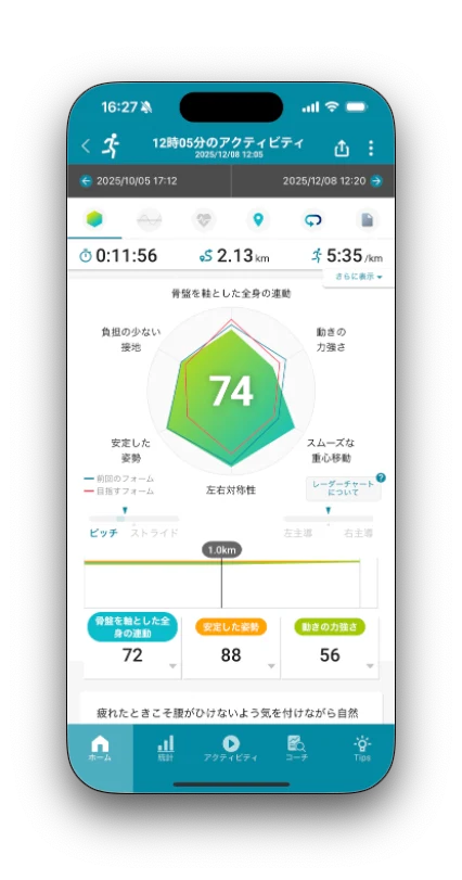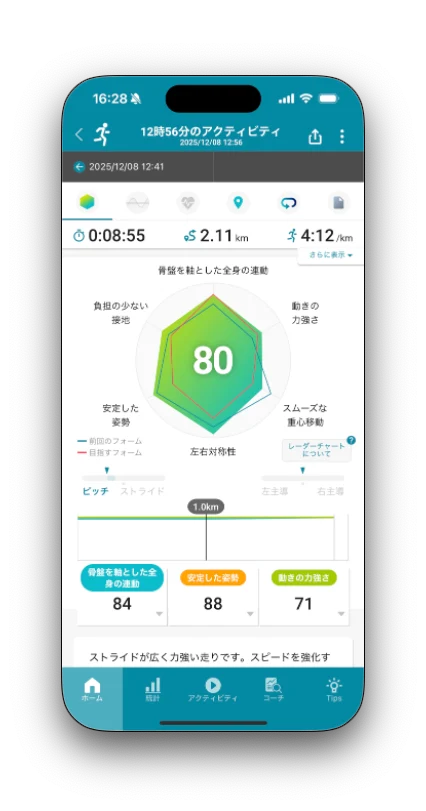サブ3ペースでは大きな差が出ました。「骨盤を軸とした全身の運動」「スムーズな重心移動」「負担の少ない着地」の3項目で、同じソールとは思えないような数値になっています。