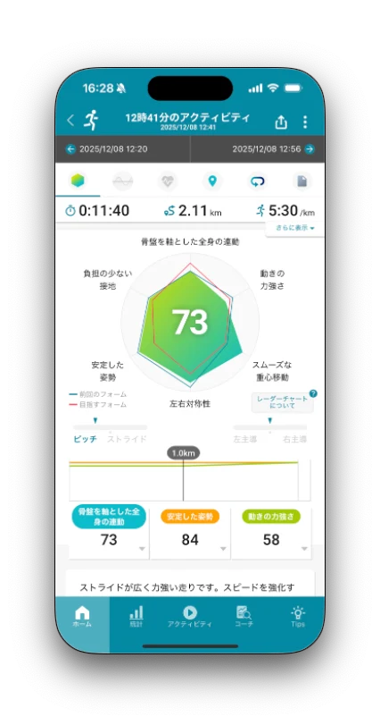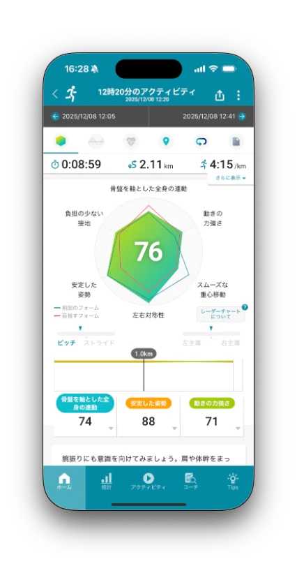 | 骨盤を軸とした全身の運動 | 動きの力強さ | スムーズな重心移動 | 左右対称性 | 安定した姿勢 | 負担の少ない着地 | |