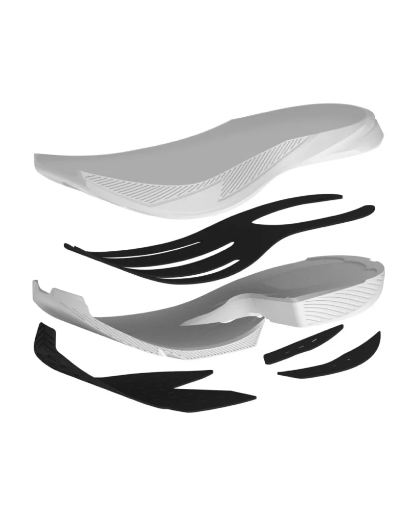 後足部にかけて翼のように分かれている部分はヒール接地時の安定性を考慮し、中足部の裏の部分も厚くすることにより着地時にブレが起きにくいように設計されています。