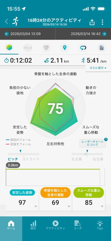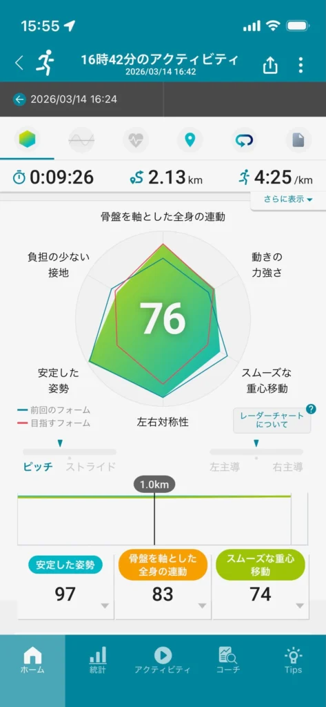 そしてレースペースになると「骨盤を軸とした全身の運動」の評価値が上がり、「負担の少ない接地」と「スムーズな重心移動」の評価値が下がっています。レースペースでは踵の反発をあまり使えておらず、体の動きでスピードを出していたため、このような結果になったと考察できます。