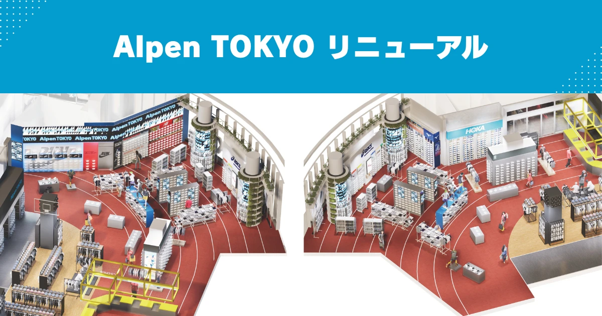 Alpen TOKYOの1階ランニングフロアが2025年7月1日にリニューアルオープンしました。リニューアルにより、取り扱うランニングシューズは16ブランド1万点以上となり、よりスムーズにランニングシューズを選べる設備も導入されます。