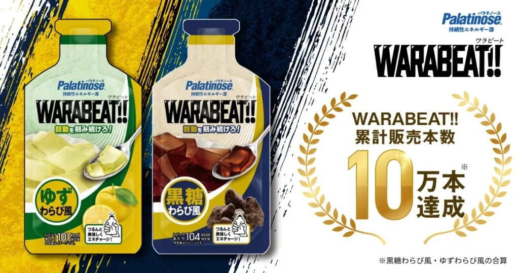 「WARABEAT!!」は、砂糖と同じエネルギー量(1gあたり4kcal)ながらも、小腸全体の吸収スピードが約5分の1でゆっくりであるという性質をもつパラチノースを配合した持久系エナジージェルです。