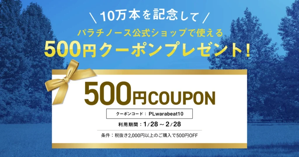 WARABEAT!!10万本達成を記念し、パラチノース公式オンラインショップで使える500円OFFクーポンを期間限定で配布中です。