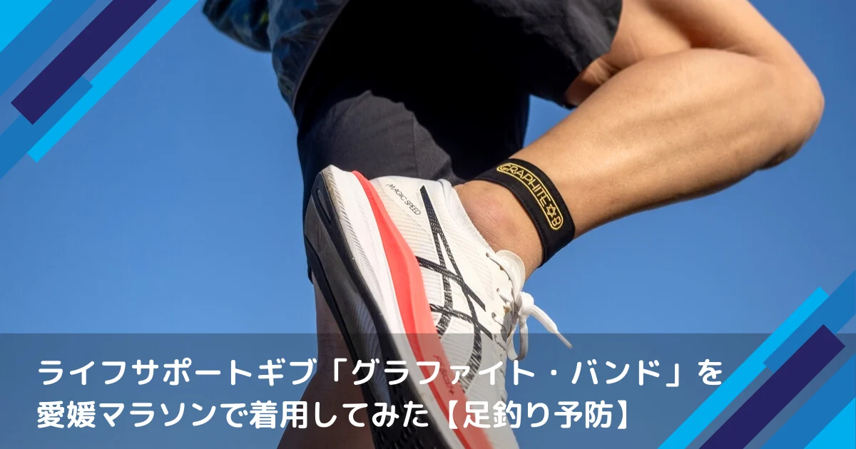 これらすべてをライフサポートギブの「グラファイト・バンド」の効果と断言できるほどのデータはありませんが、実感は確かにあるので、このままレビュー記事にするよりは、より過酷な環境で試してみるべきだと感じて、愛媛マラソンに導入してみました。