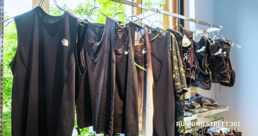 アディダスやナイキといった大手だけでなく、新進気鋭のガレージブランドもラインナップに加わっているのも「ALPEN RUN MEIJI PARK」の特長のひとつです。ウェアや小物も、スタッフが本当に使ってもらいたいと感じたものだけを厳選して販売しています。